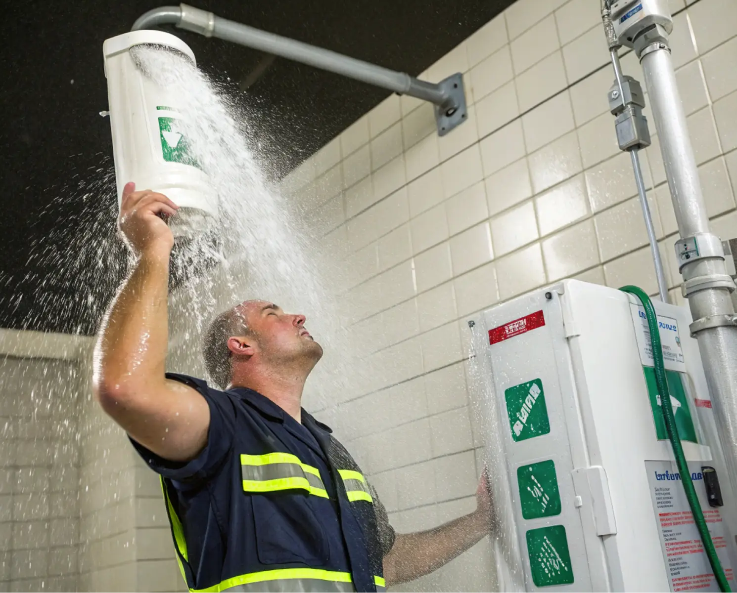 Nød-dusjer, som ofte overses, er kritiske i industrielle anlegg, men kan huse bakterier på grunn av stillestående vann. Anolytechs system sikrer kontinuerlig desinfeksjon, noe som garanterer at trygt vann alltid er tilgjengelig uten behov for sterke kjemikalier.