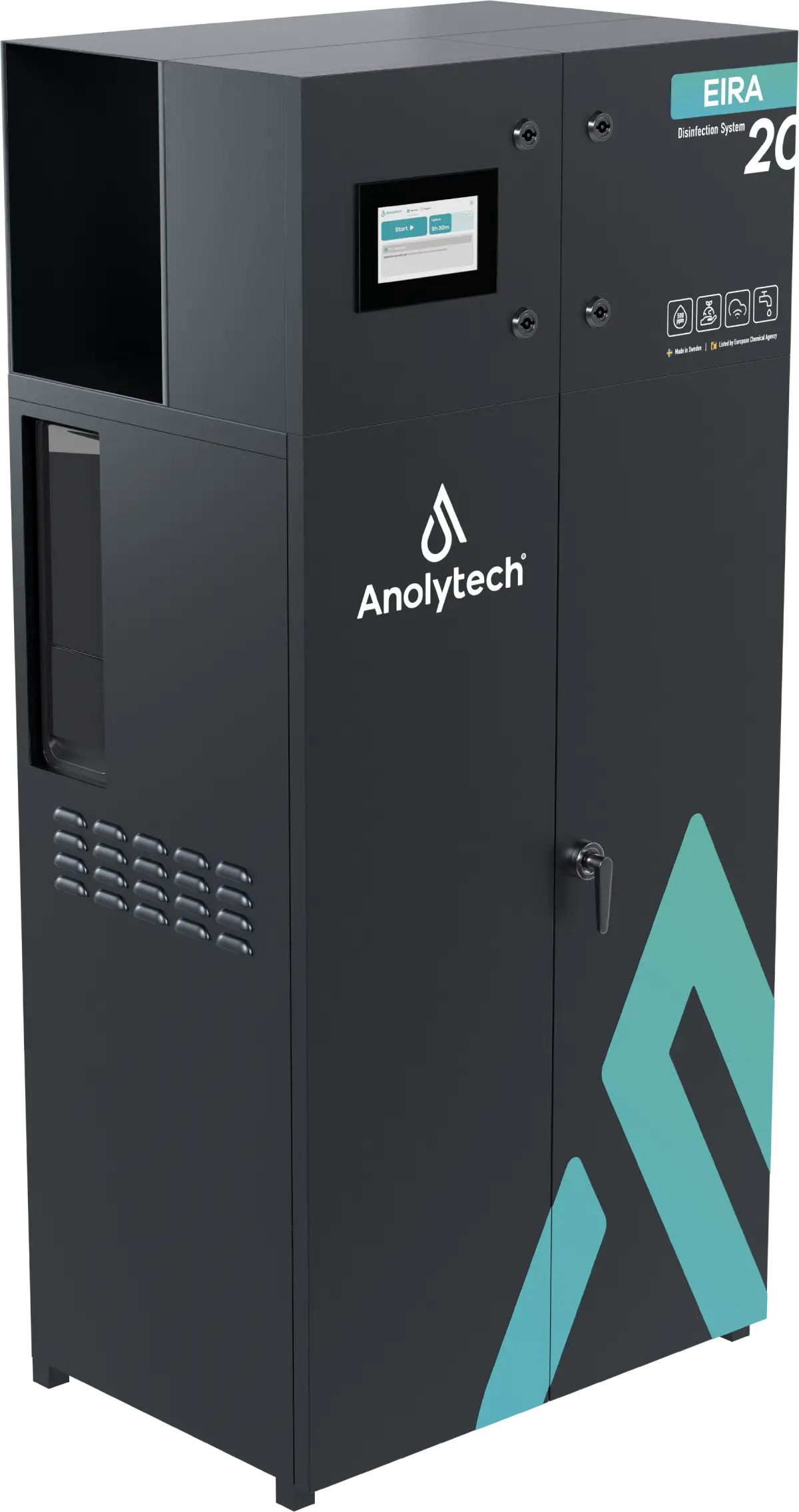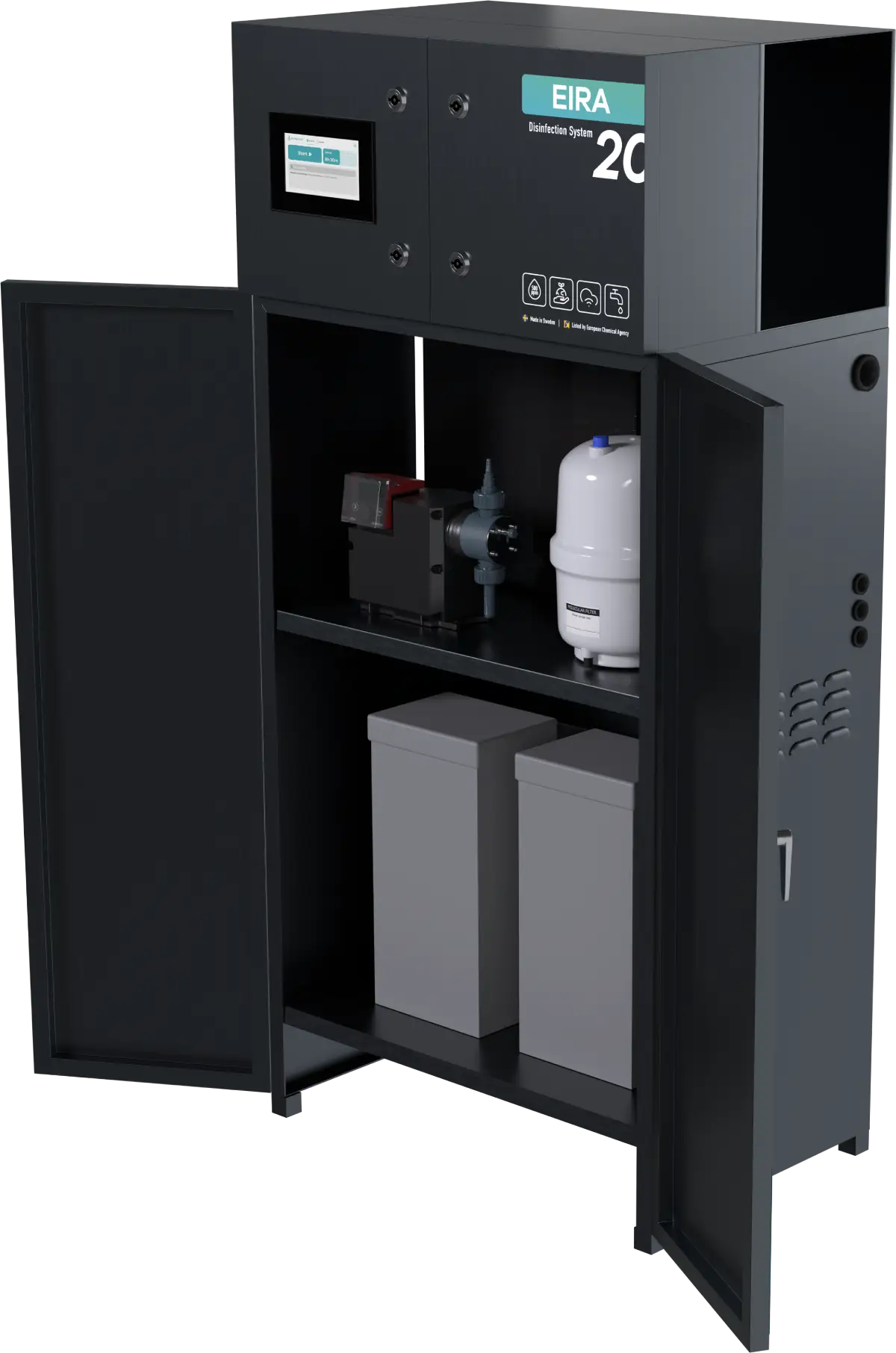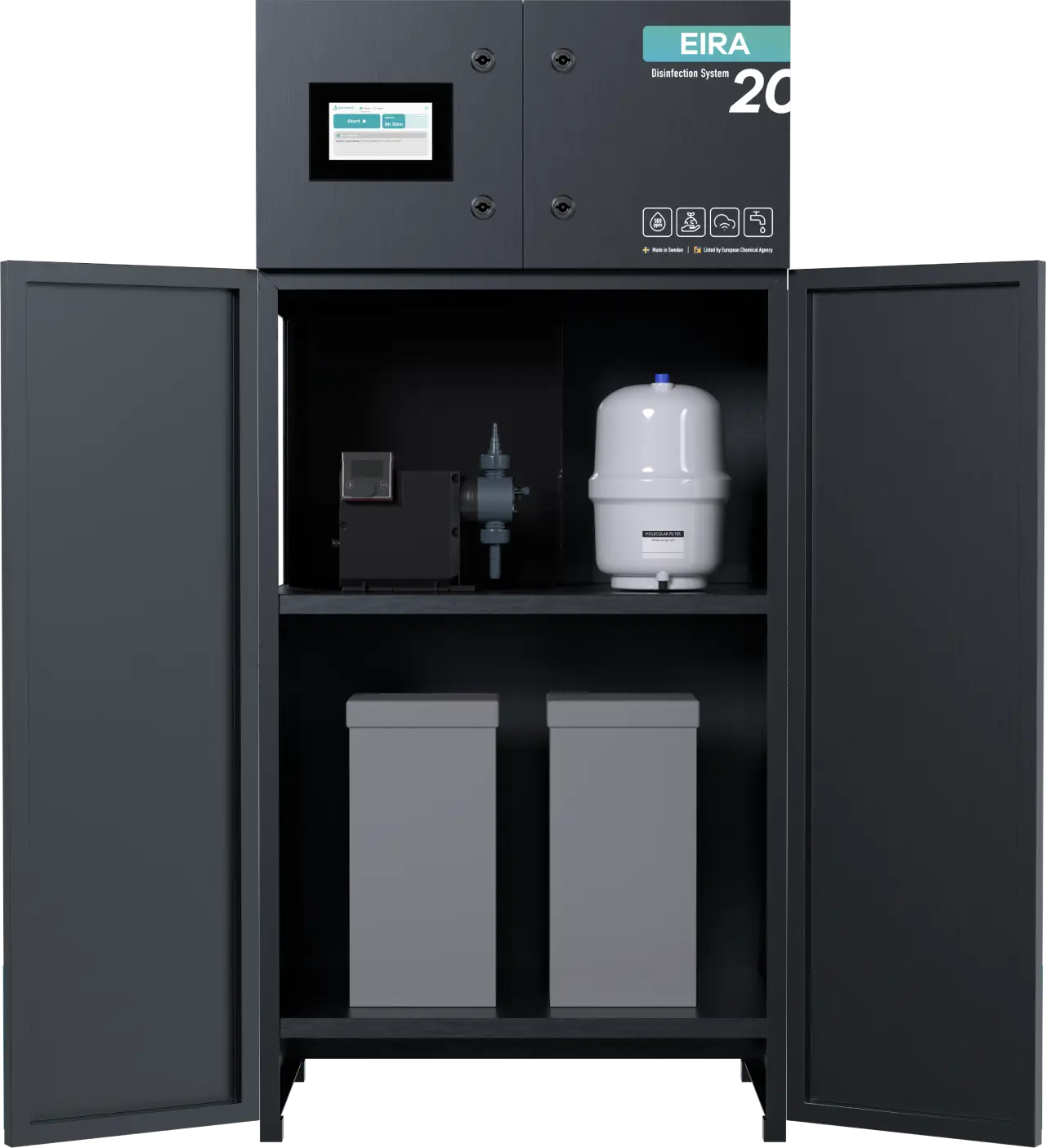 The Eira series is designed to meet the property sector’s need for safe water and protection against bacteria such as Legionella. The Eira M20 produces up to 20 liters of AnoDes per hour and is a size suited to most property customers. A reliable choice for properties that need a robust, sustainable solution for bacteria-free water and dependable operation.