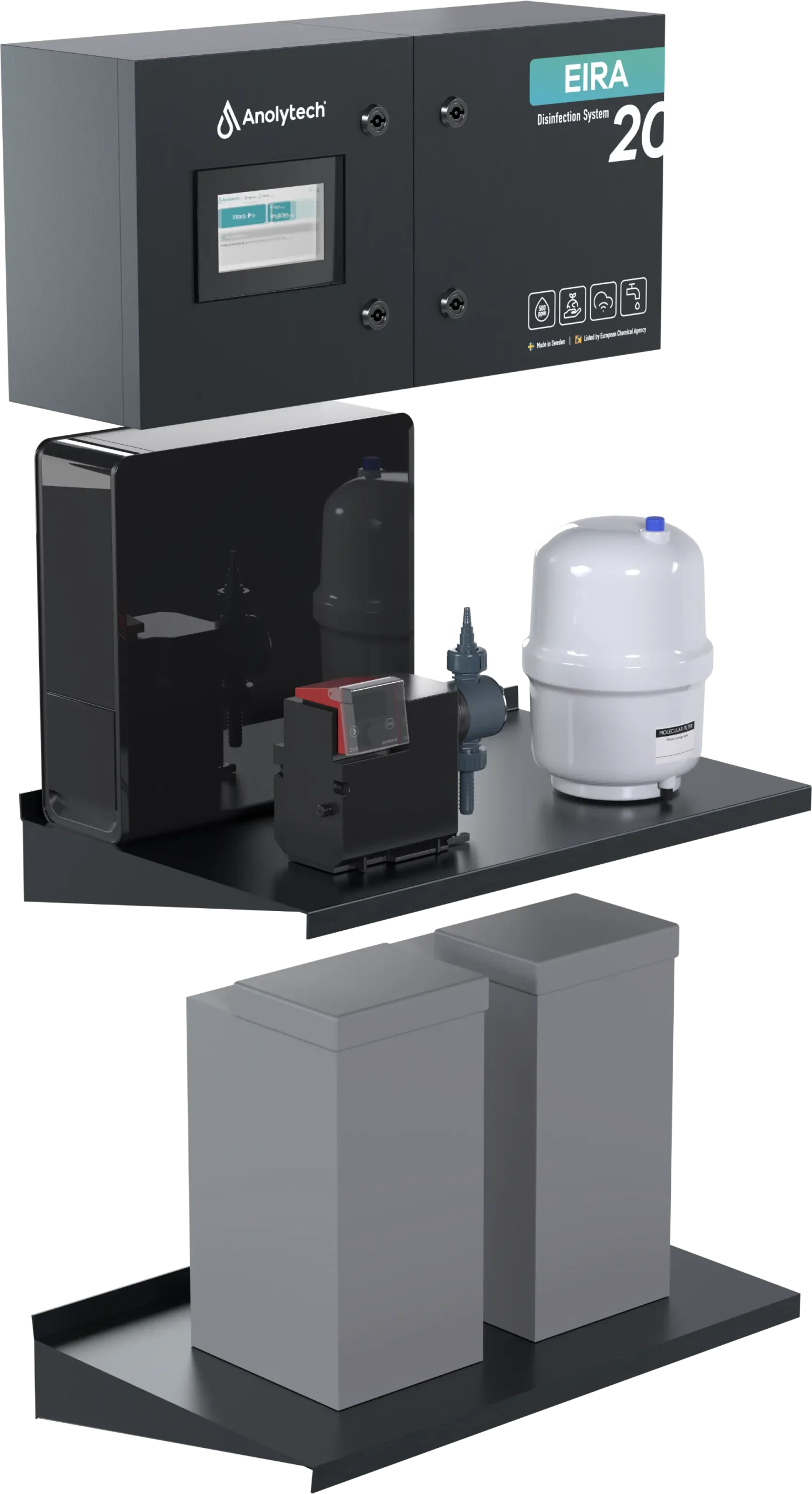The Eira series is designed to meet the property sector’s need for safe water and protection against bacteria such as Legionella. The Eira M20 Flexi produces up to 20 liters of AnoDes per hour and is a size suited to most property customers. The Flexi variant is designed for installations where the cabinet won’t fit, delivering the same safe and sustainable disinfection in a more adaptable format. A reliable choice for properties that need a flexible solution for bacteria-free water and dependable operation.