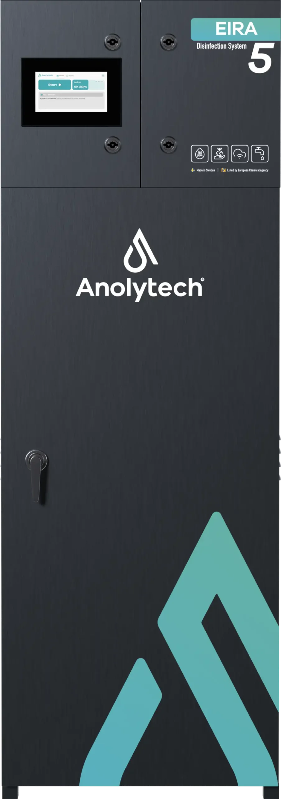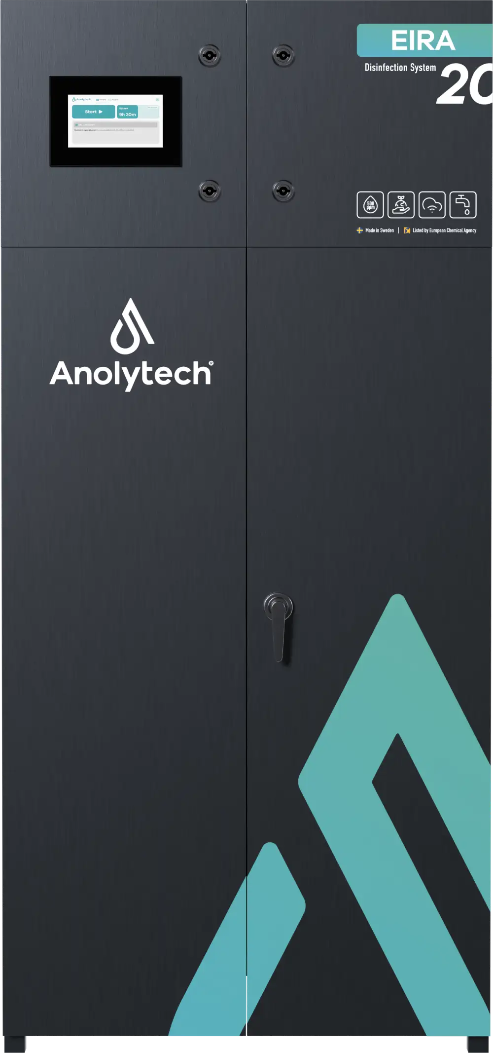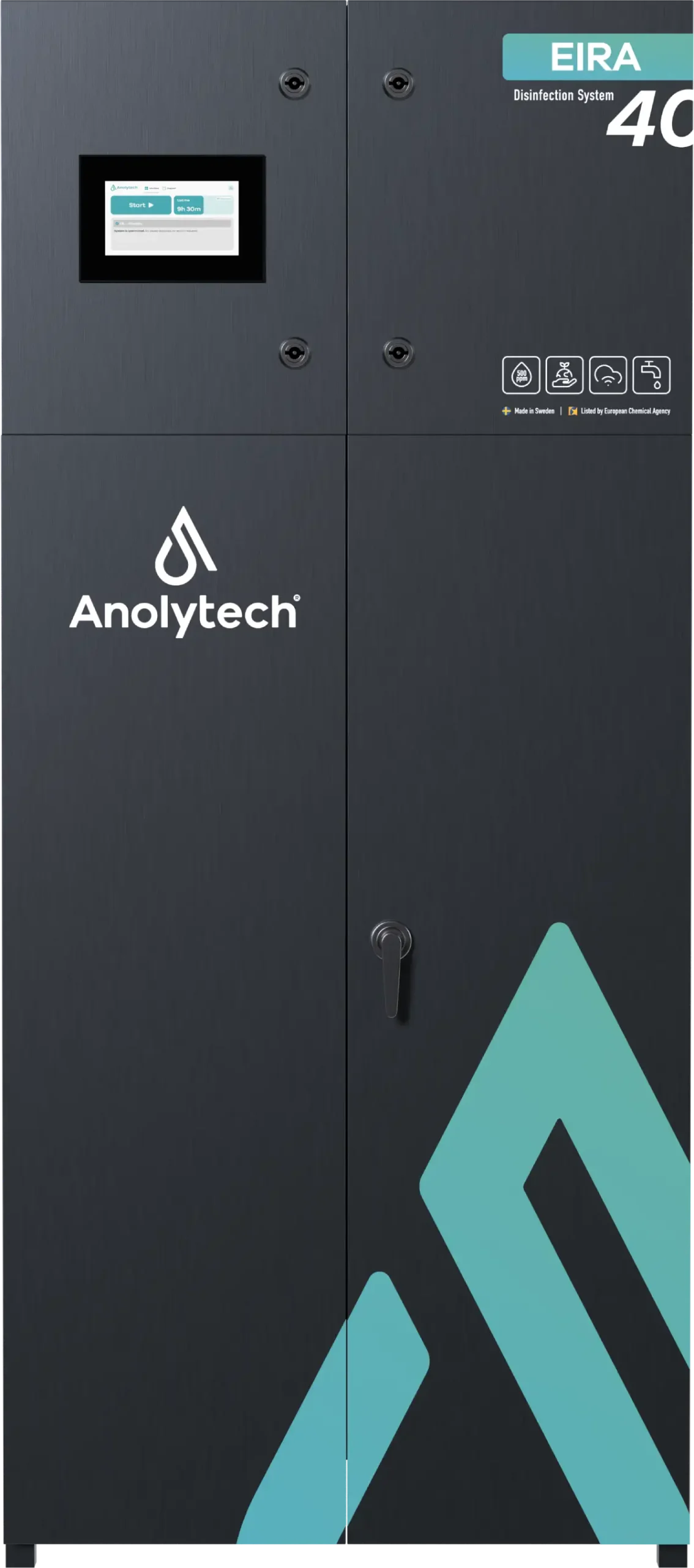The Eira series is designed to meet the property sector’s need for safe water and protection against bacteria such as Legionella. The Eira M40 produces up to 40 liters of AnoDes per hour and is a model suited to properties with higher water consumption. A reliable choice for facilities that need a robust, sustainable solution for bacteria-free water and dependable operation.