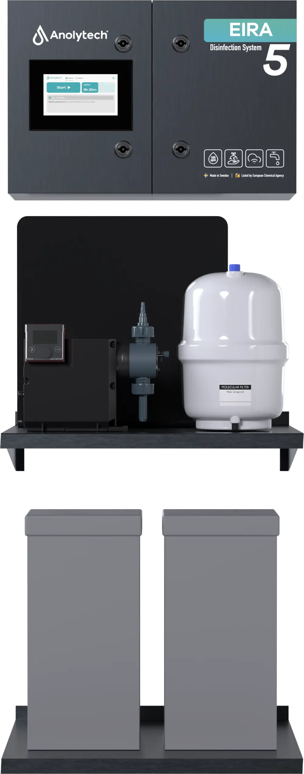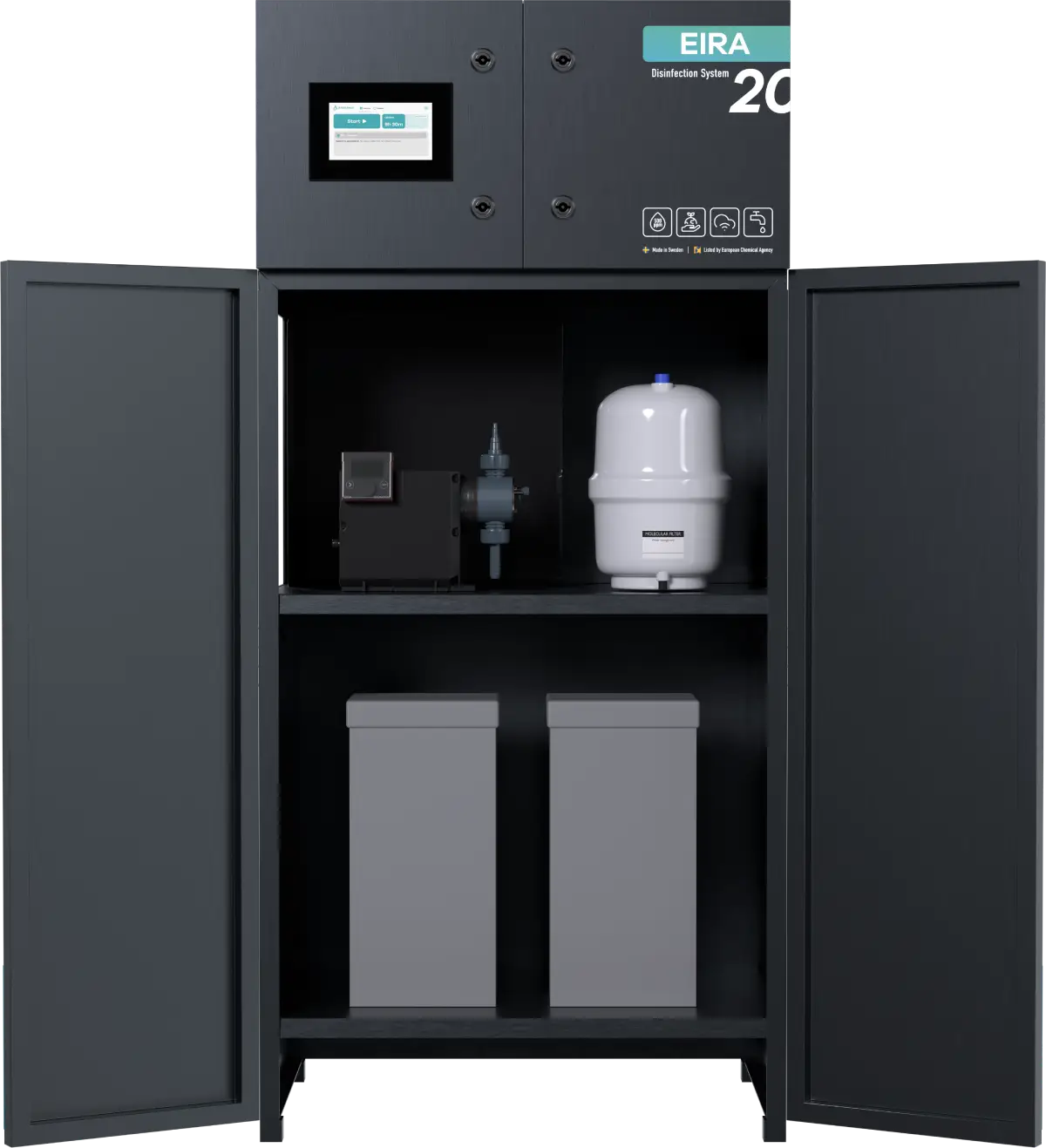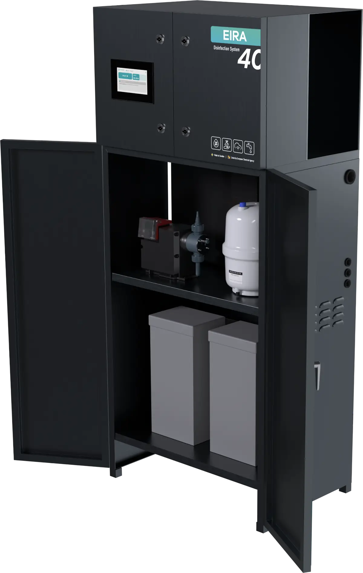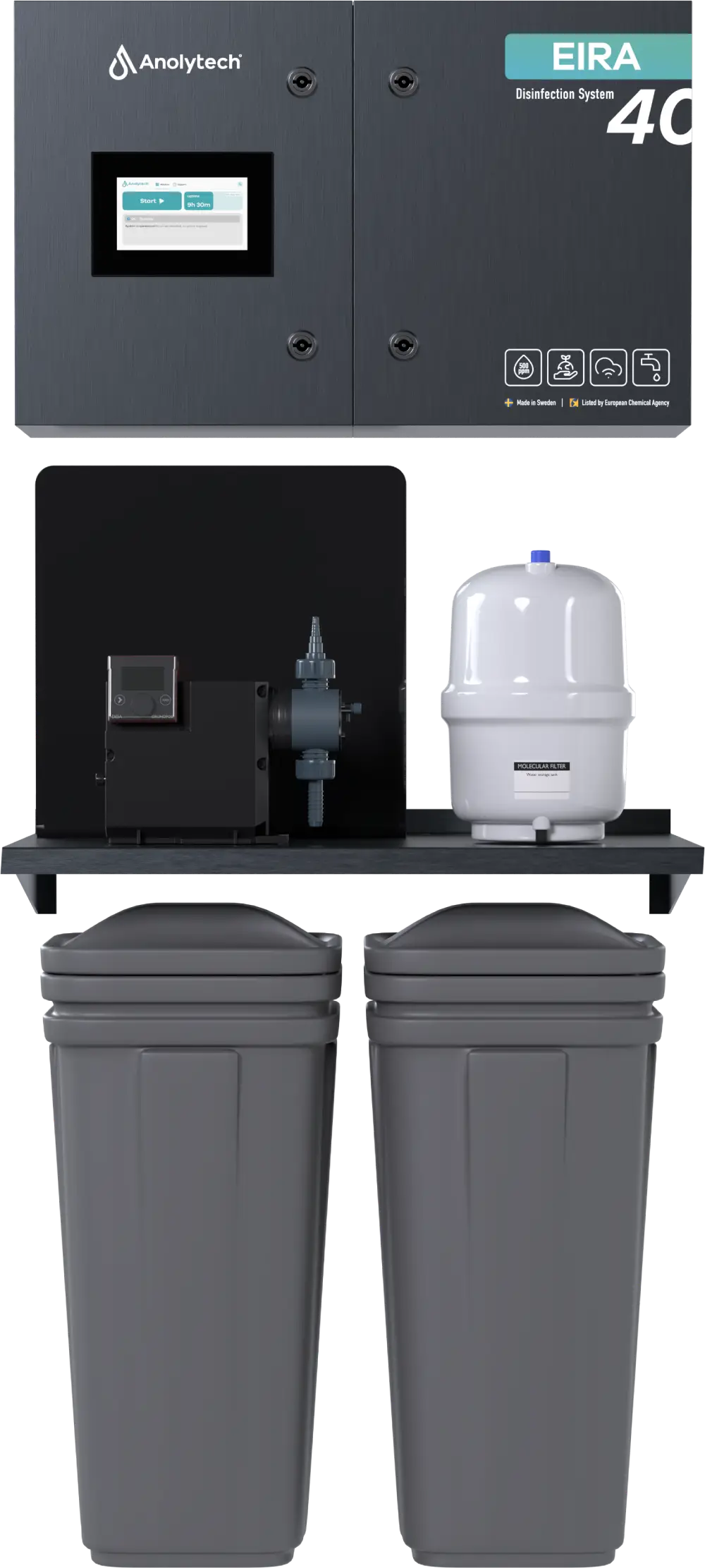 The Eira series is designed to meet the property sector’s need for safe water and protection against bacteria such as Legionella. The Eira M40 produces up to 40 liters of AnoDes per hour and is a model suited to properties with higher water consumption. A reliable choice for facilities that need a robust, sustainable solution for bacteria-free water and dependable operation.