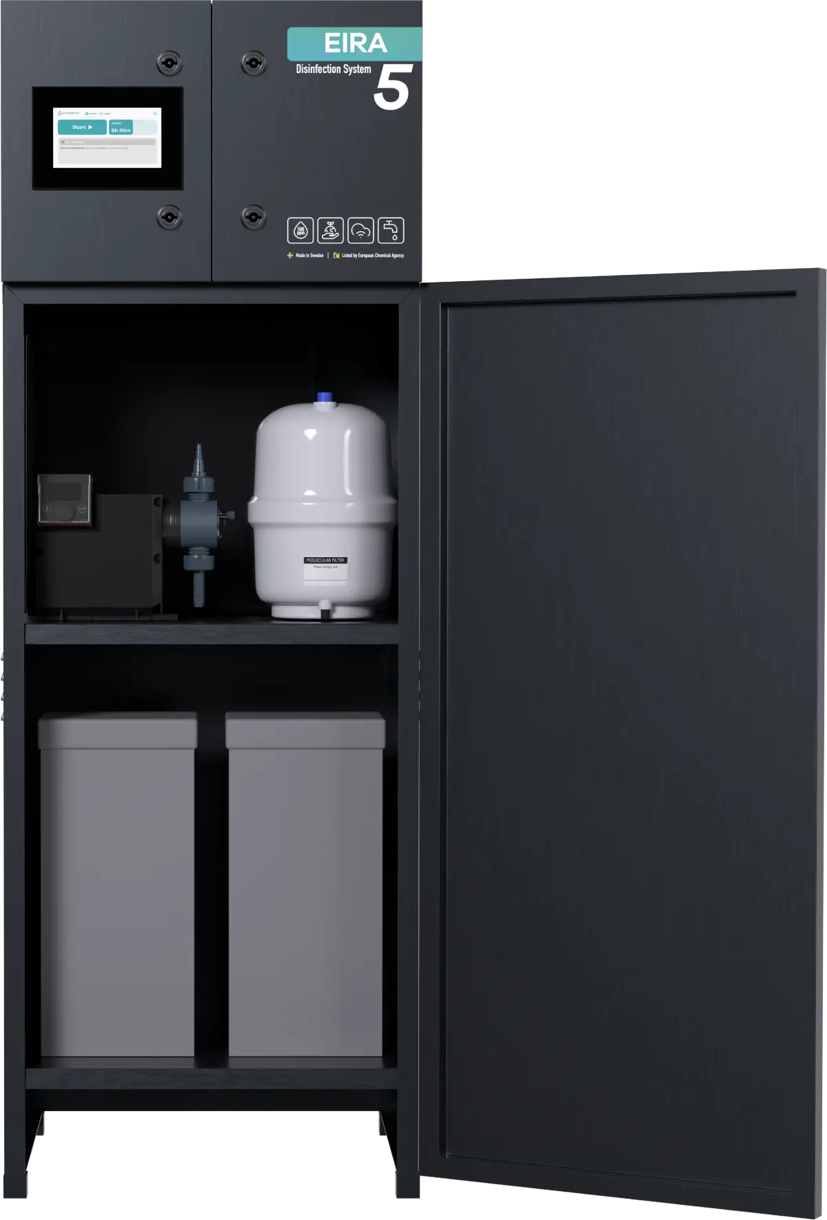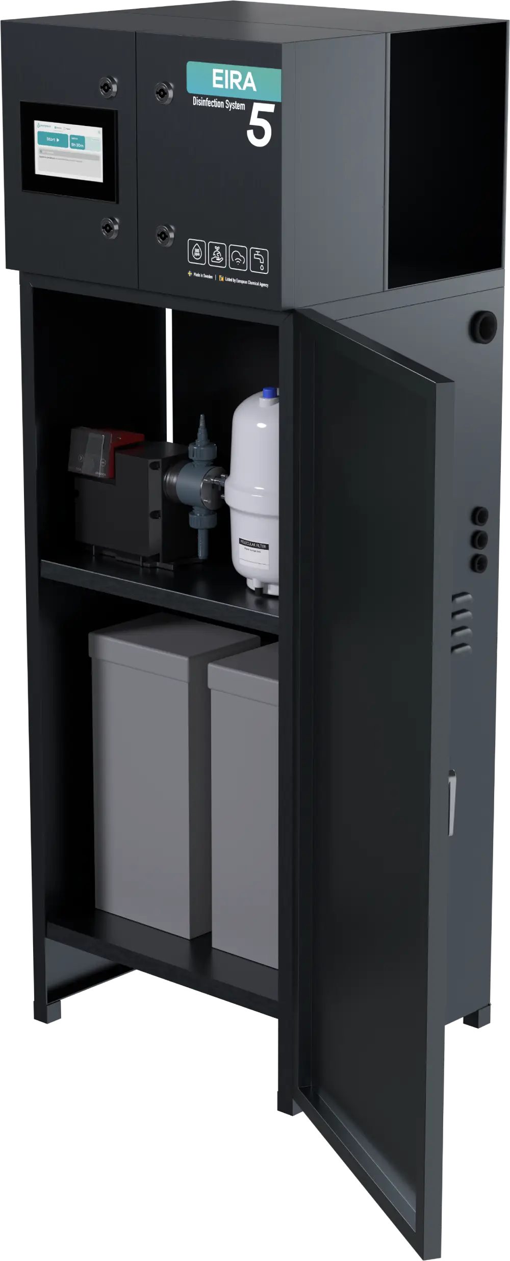 The Eira series is designed to meet the property sector’s need for safe water and protection against bacteria such as Legionella. The Eira M5 produces up to 5 liters of AnoDes per hour and is the smallest model in the range. A reliable choice for properties with lower water consumption that need a solution for bacteria-free water and dependable operation.