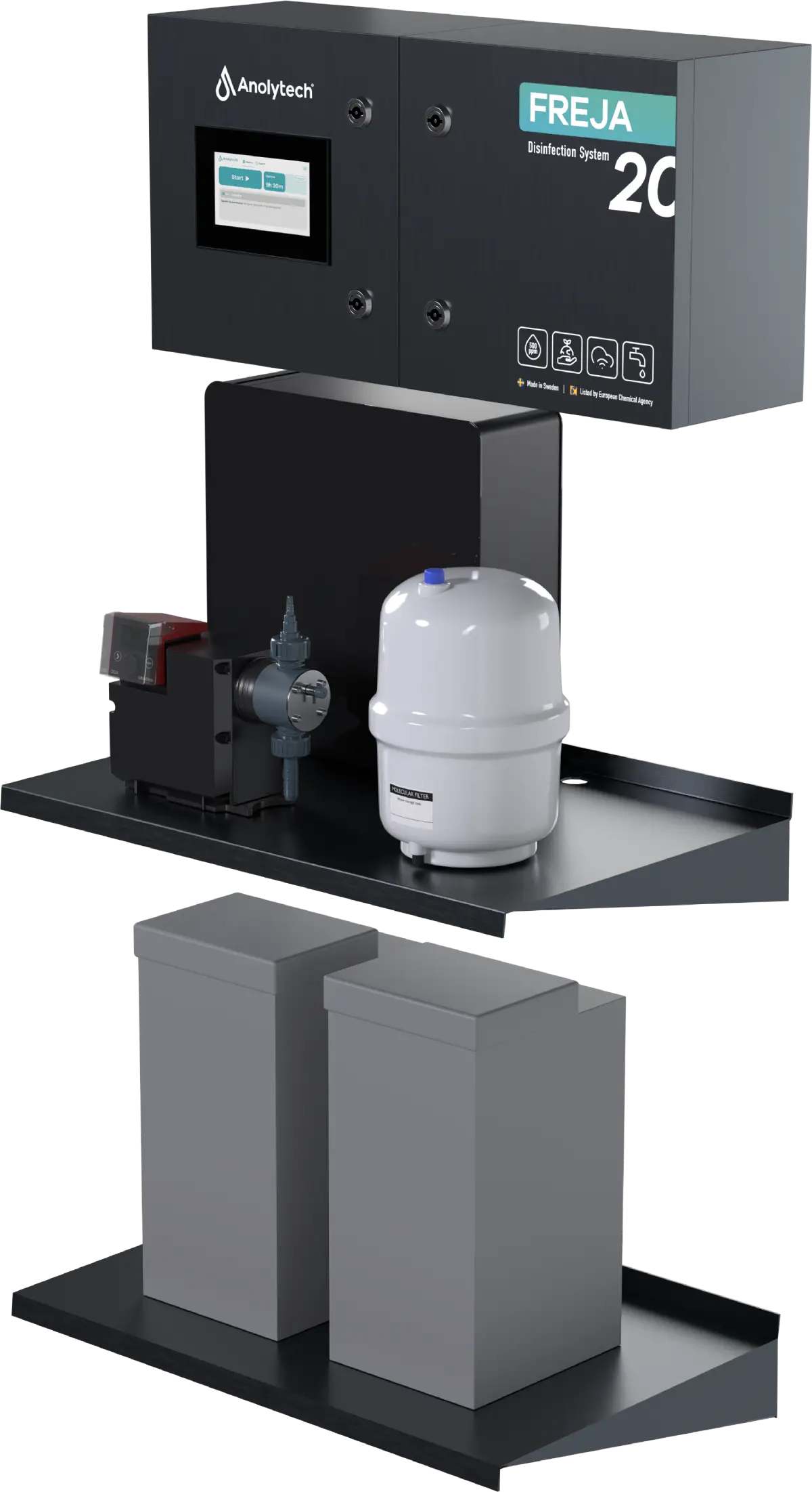 The Freja series is designed to meet the agricultural sector’s need for bacteria-free water through effective disinfection. The Freja M20 Flexi produces up to 20 liters of AnoDes per hour and is a model suited to most agricultural operations. The Flexi variant is designed for installations where the cabinet won’t fit, delivering the same safe and sustainable disinfection in a more adaptable format. A reliable choice for farms with a daily need for safe disinfection and a flexible solution for reliable water quality.