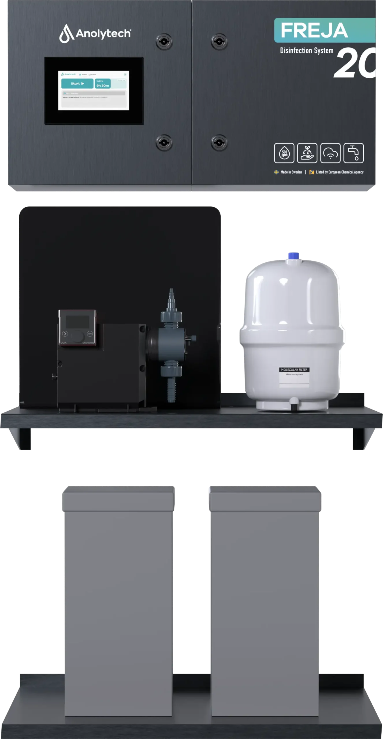 The installation takes place in two steps. First, an injector is prepared for the facility’s existing system (provided by Anolytech but installed by the customer). Then Anolytech’s technicians install the disinfection system.