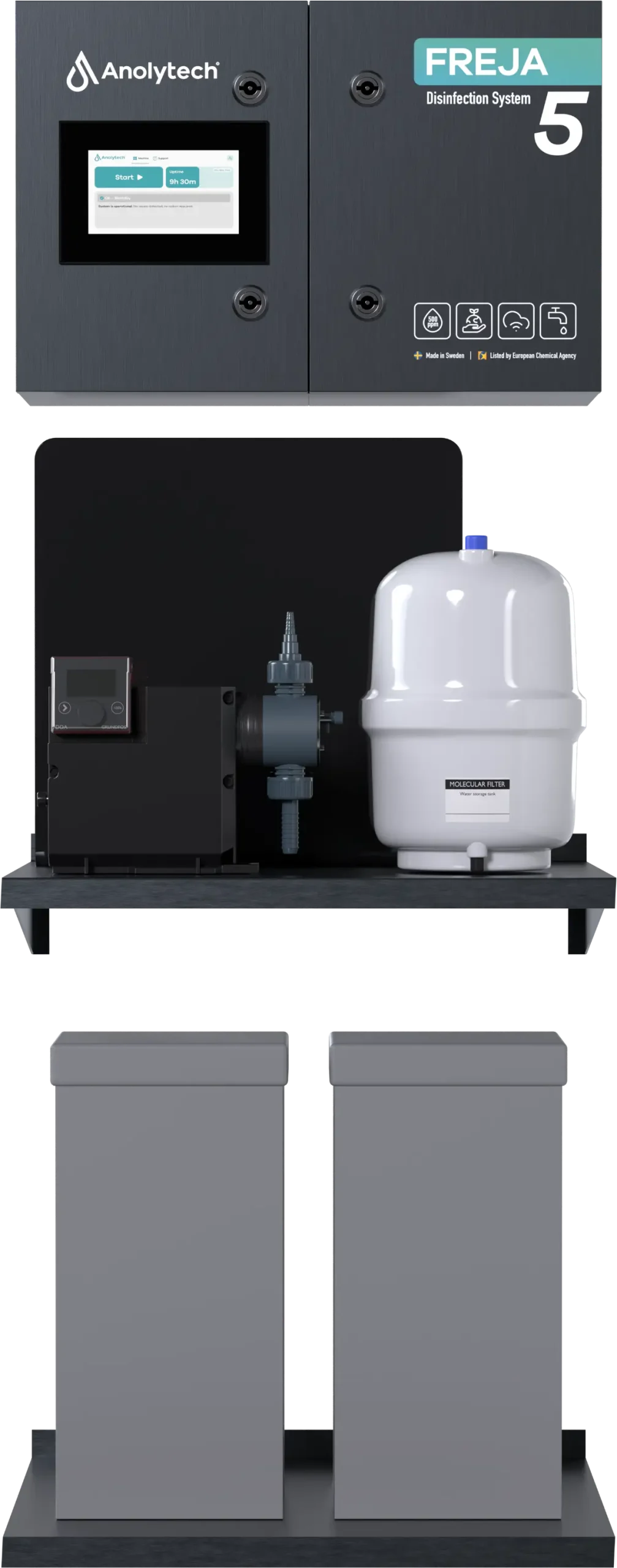 The installation takes place in two steps. First, an injector is prepared for the facility’s existing system (provided by Anolytech but installed by the customer). Then Anolytech’s technicians install the disinfection system.