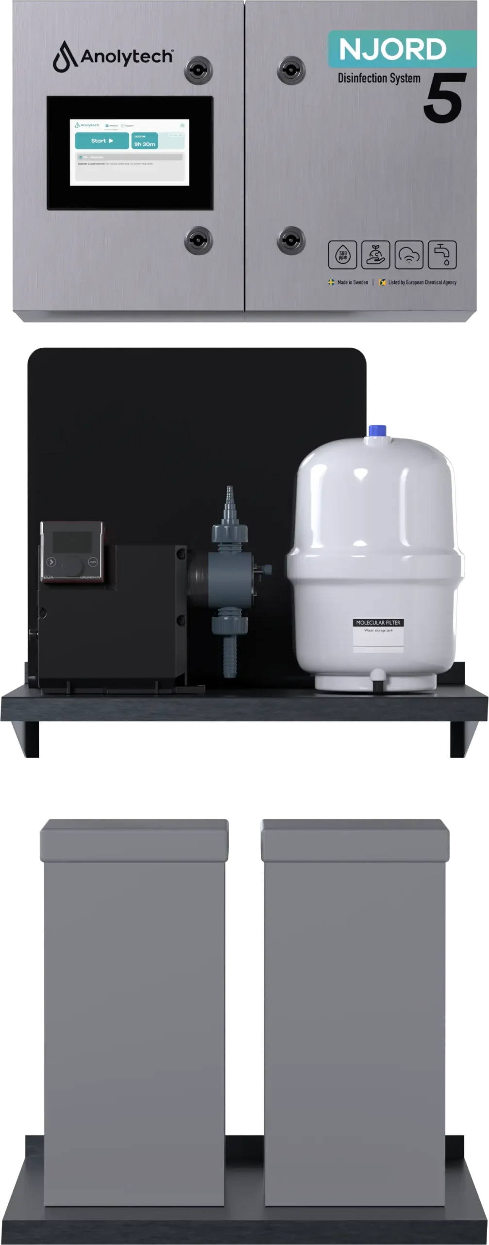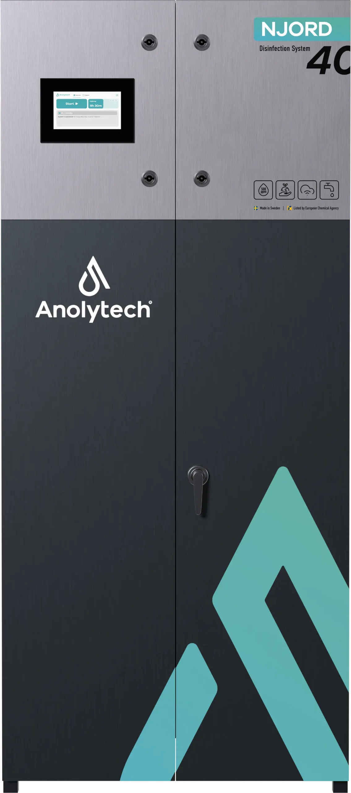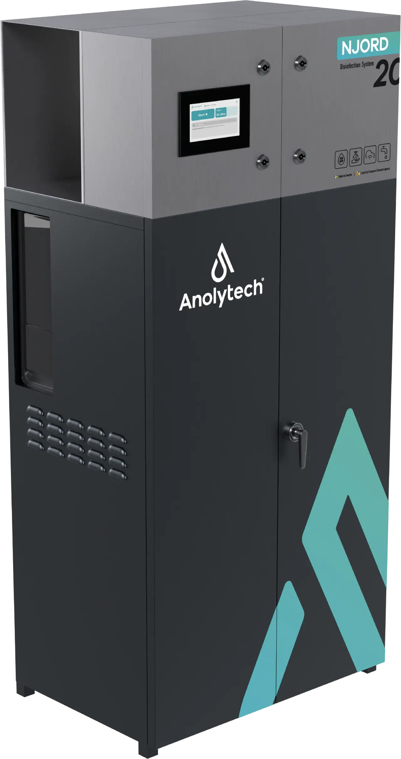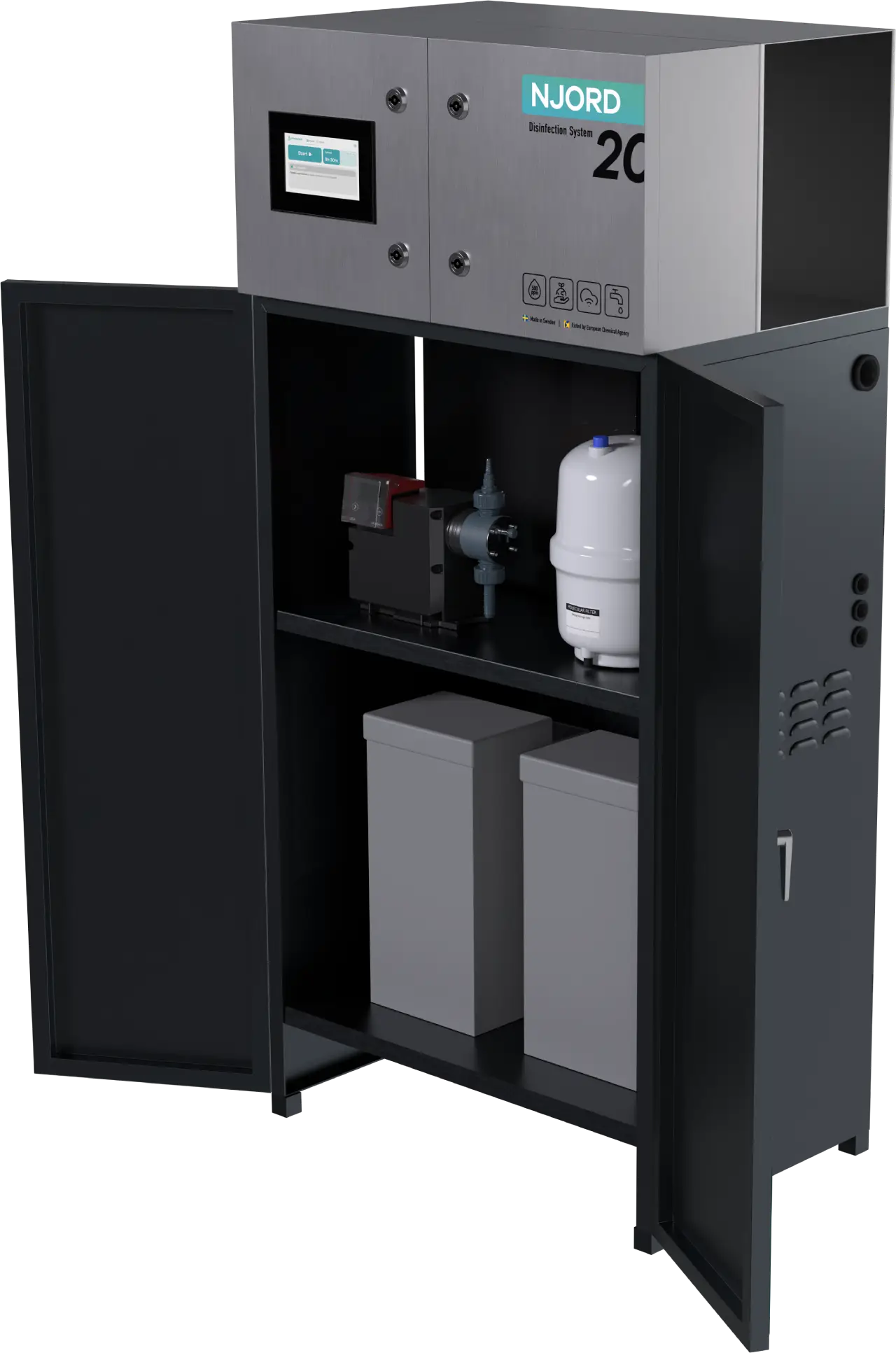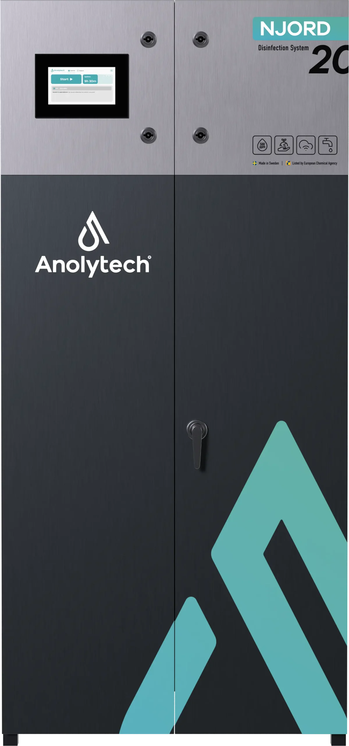 The Njord series is designed to meet the maritime sector’s need for safe water and protection against bacteria such as Legionella. The Njord M20 produces up to 20 liters of AnoDes per hour and is a size suited to most customers in the maritime industry. A reliable choice for vessels and marine facilities with a daily need for safe, sustainable disinfection.