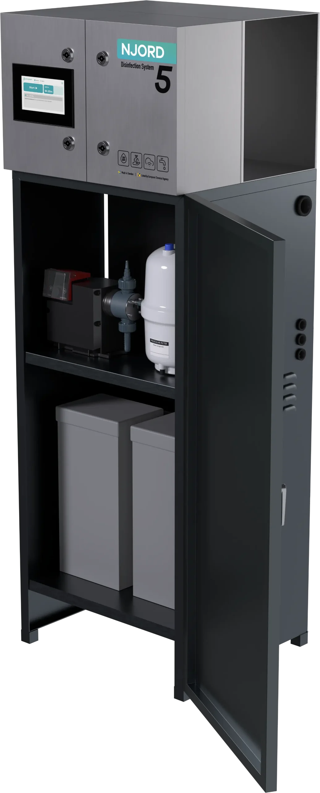 The Njord series is designed to meet the maritime sector’s need for safe water and protection against bacteria such as Legionella. The Njord M5 produces up to 5 liters of AnoDes per hour and is the smallest model in the range. A reliable choice for vessels and facilities with lower water consumption that need a compact, dependable solution for bacteria-free water and reliable operation.